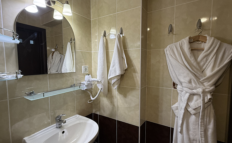 - косметические и банные принадлежности (шапочка для душа, шампунь, гель для душа, мыло, полотенце для рук, полотенце для ног, банное полотенце, тапочки),