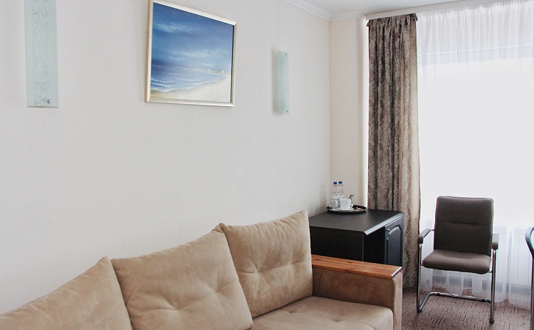 Номера оборудованы особой системой освещения и каждая деталь продумана до мелочей. Просторная гостиная с мягким диваном, журнальным столиком и уютная спальняс двумя полутороспальными кроватями (120х200 см) располагают всем необходимым для работы и отдыха. Данная категория предусматривает одно/двух/трехместное размещение. Номера расположены на 6 этаже.
